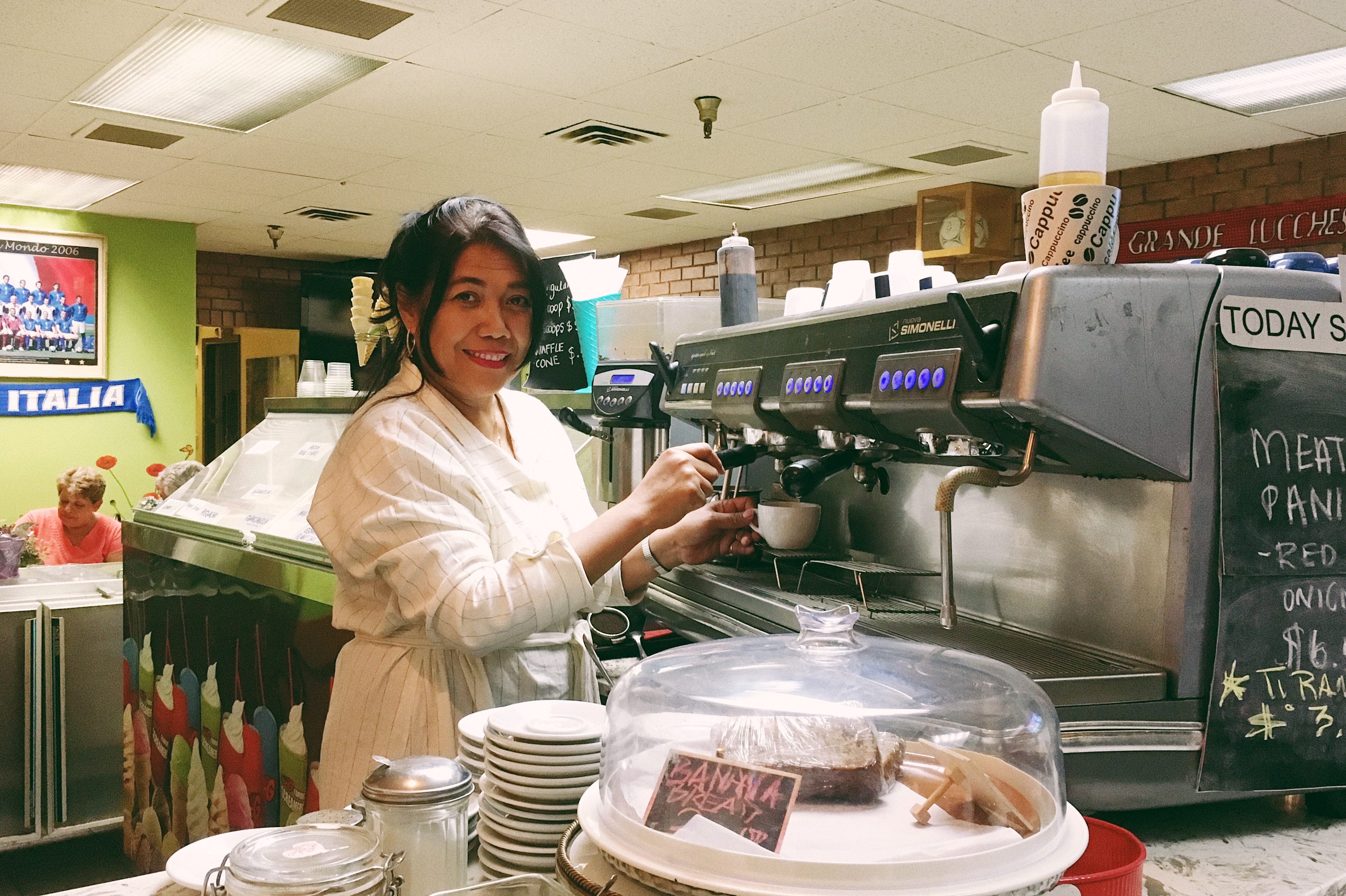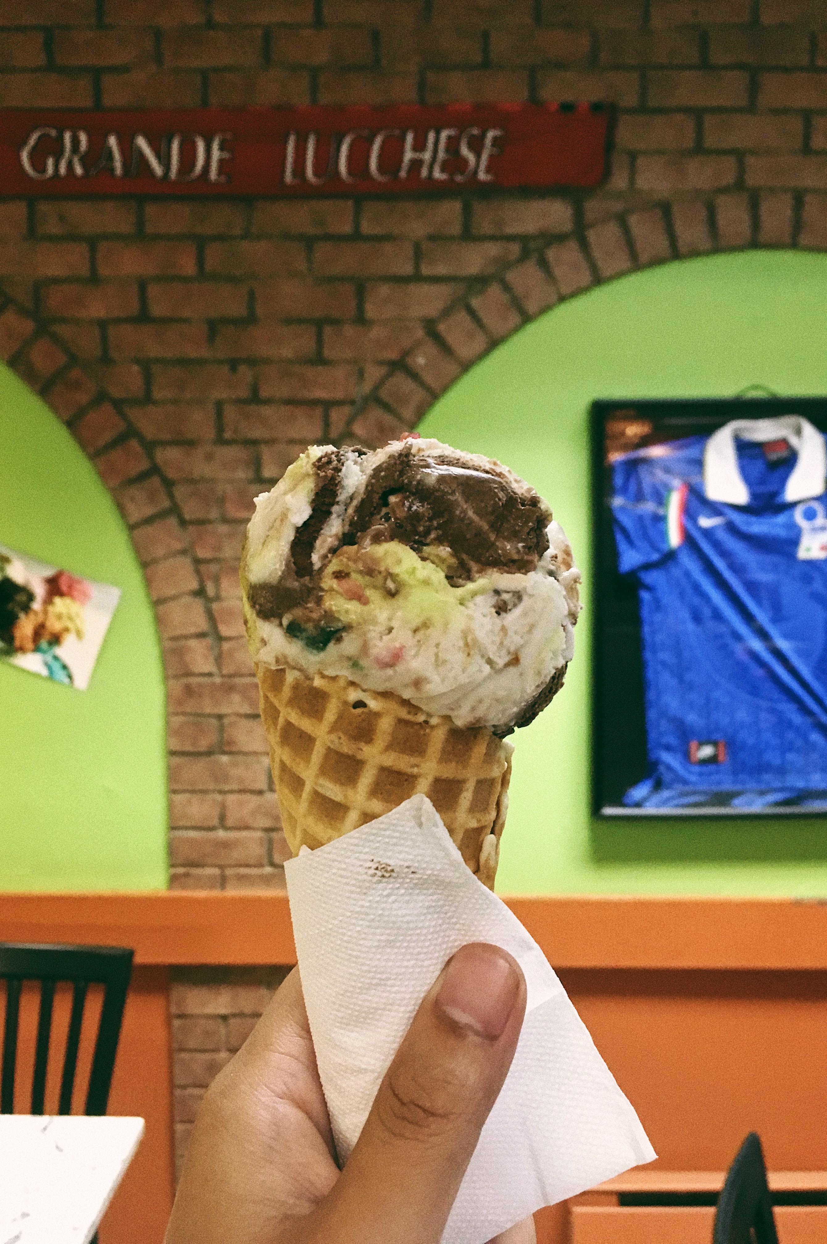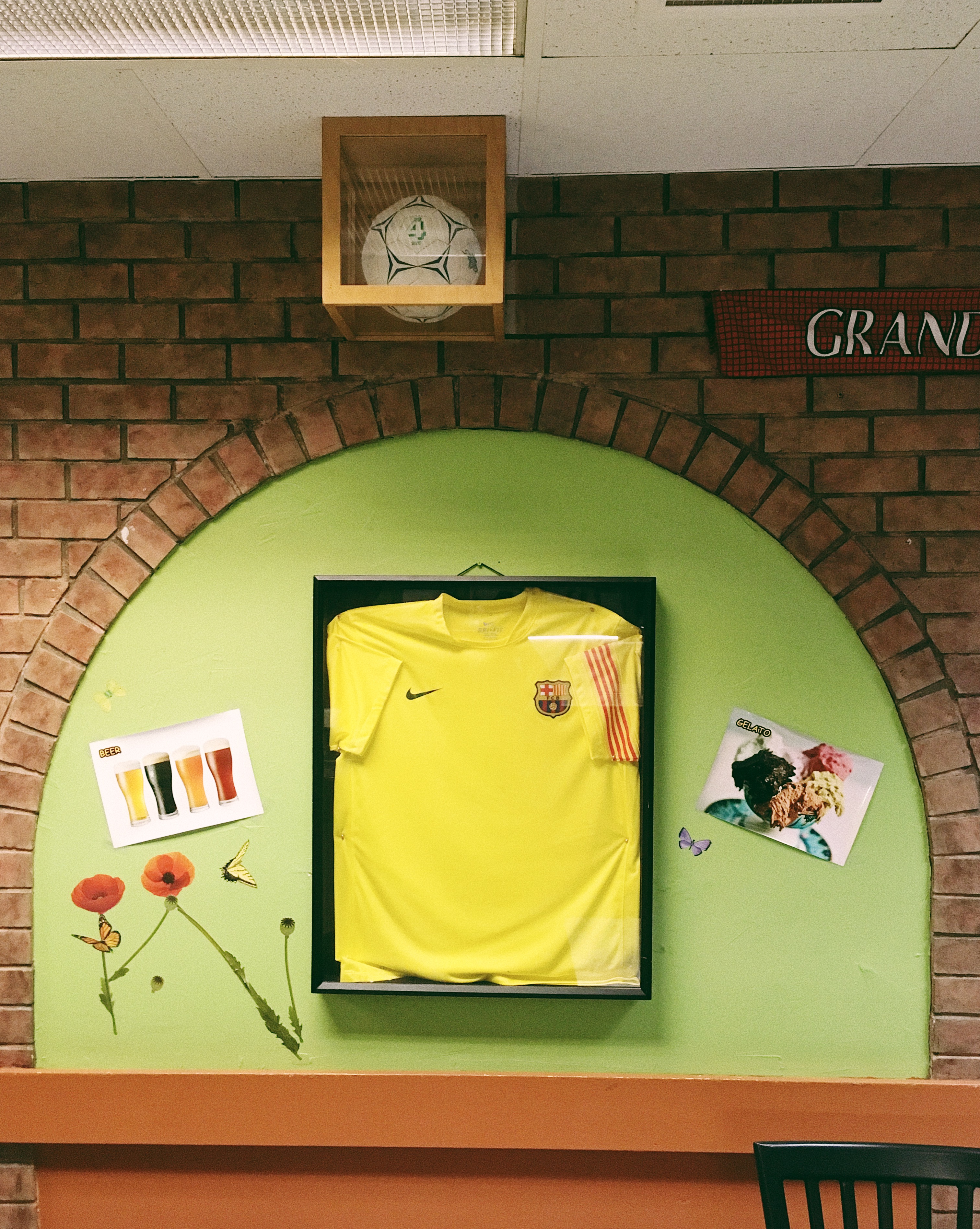 Interiornya dipenuhi pajangan kaos sepakbola, sebuah TV berukuran besar dan sebuah bola di dalam kotak kaca. Bola yang digunakan pada ajang Piala Dunia. “Tempat ini sudah lama sekali ngetop buat nongkrong untuk nonton pertandingan sepakbola. Pasti heboh. Penuh sesak dan meriah banget”, lanjutnya tertawa. Kali ini sambil menyuguhkan Spumone, gelato tiga rasa — cherry, pistachio dan coklat dengan isian butiran kacang serta buah-buahan kering di dalamnya — yang menjadi cikal bakal es krim Neapolitan.