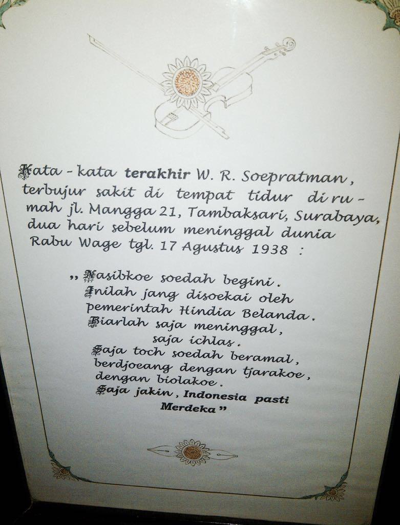 “Nasibkoe soedah begini. Inilah jang disoekai oleh Pemerintah Hindia Belanda. Biarlah saja meninggal, saja ichlas. Saja toch soedah beramal, berdjoeang dengan tjarakoe, dengan biolakoe. Saja jakin Indonesia Pasti Merdeka”.